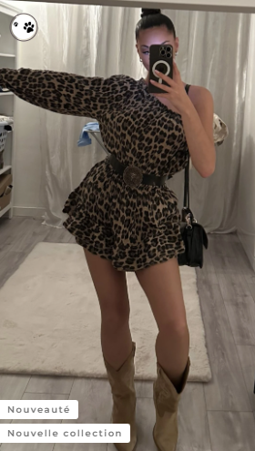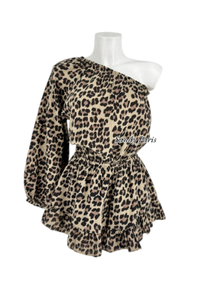 Adoptez un look audacieux et ultra tendance avec cette combinaison jupe-short asymétrique à imprimé léopard. Son design original avec une manche longue et une épaule dénudée offre une silhouette féminine et stylée. Le tissu en gaze de coton apporte légèreté et confort, idéal pour les journées ensoleillées.